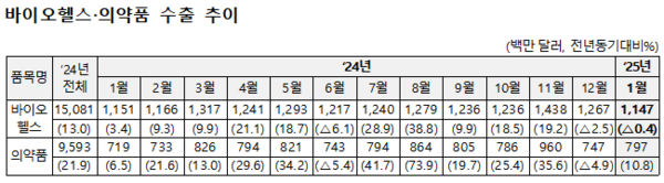 1월 바이오헬스 수출액은 11억 4700만달러로 전년 동기(11억5100만달러) 대비 400만달러 감소했으며, 이는 0.4% 감소한 수준이다.