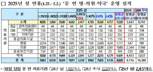 점검 결과, 이번 설 연휴 기간(1월 31일(평일) 제외) 문을 연 의료기관은 일 평균 1만 7220개소로, 당초 계획 대비 2.4% 증가했다. 이는 작년 설 연휴 대비 372.7%, 작년 추석 연휴 대비 97.0% 증가한 수치이다.