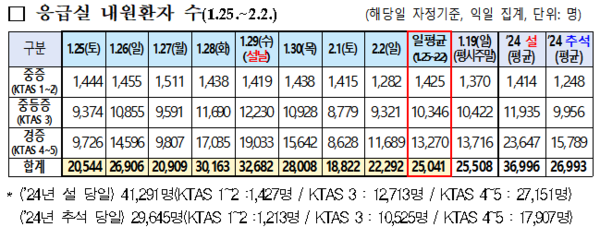 설 연휴 기간 응급실 내원환자는 일 평균 2만 5041명으로, 작년 설 연휴 대비 약 32.3% 감소했다. 이는 주로 경증환자(KTAS 4~5) 대폭 감소에 기인한 것으로, 경증환자는 작년 설 대비 43% 이상 감소했다.