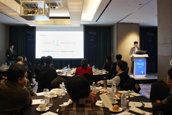 첫 번째 세션에서는 알테오젠 RA총괄 이선배 상무가 테르가제의 기술력과 우수성에 대해 발표했다. 동물 유래 히알루로니다제 대비 높은 순도와 안전성을 갖춘 유전자 재조합 인간 히알루로니다제의 특징을 설명하고, 바이오의약품 GMP 공정을 통한 철저한 품질 관리를 강조했다.