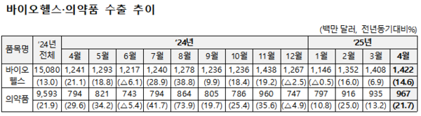 4월 바이오헬스 수출액은 14억 2200만달러로 전년 동기(12억4100만달러) 대비 1억 8100만달러 늘어났으며, 증가율로는 14.6%였다.