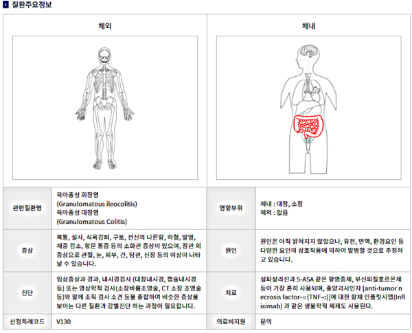 질병관리청은 크론병에 대한 의료비 지원과 쉼터 운영을 지원하고 있다.