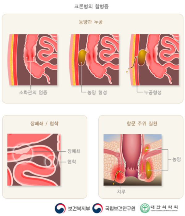‘스테로이드’는 중증도에서 중증의 크론병 관해 유도에 효과적이지만, 관해 유지에는 효과가 없으며 장기간 사용 시 부작용이 발생하며, ‘항생제’는 항문 주위에 생긴 누공과 농양 치료에 사용된다.