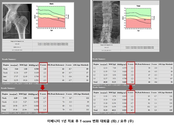 이 후 1년째 시행한 골밀도 검사상 대퇴 경부의 T-score는 -1.7이었고, 대퇴 전체의 T-score는 -1.5 로 큰 호전을 보였으며, L1-L4의 T-score는 -0.7로 이베니티의 효과를 크게 보았다.