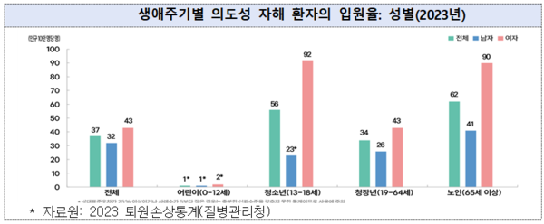 생애주기별 의도성 자해 환자 입원율(인구 10만 명당)은 노인(65세 이상)이 62명으로 가장 많았고, 청소년(13-18세) 56명, 청장년(19-64세) 34명, 어린이(0-12세) 1명 순이었다. 2013년과 비교하면 청소년은 가파르게 증가(2013년 30명→2023년 56명, 86.7%↑)하다가 2023년 약간 감소했고, 노인은 2021년 감소한 이후 다시 증가 추세를 보이고 있어 눈여겨 볼 필요가 있다.