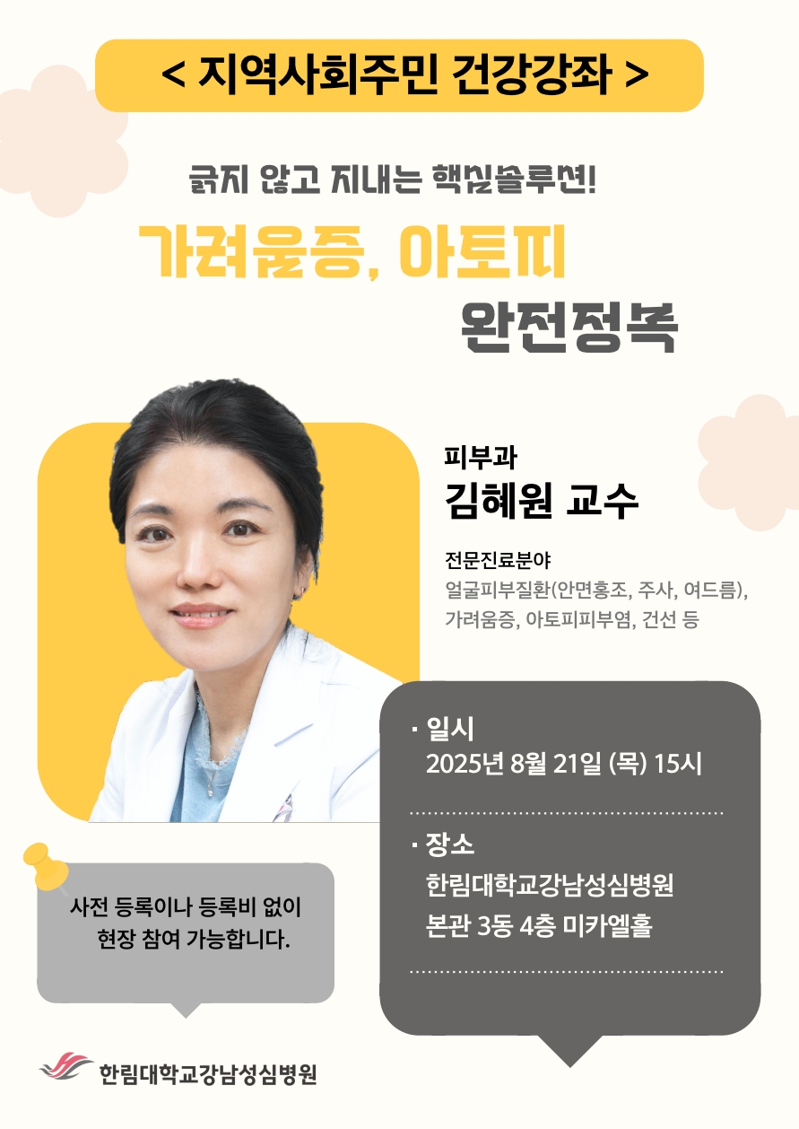 [의학신문·일간보사=최진욱 기자] 한림대강남성심병원(원장 이동진)은 오는 21일 본관 3동 4층 미카엘홀에서 ‘가려움증, 아토피 완전 정복’을 주제로 건강강좌를 개최한다고 밝혔다.