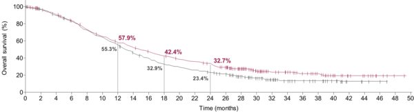 해당 임상시험에 포함된 전체 환자에서 테빔브라+항암화학요법 투여군은 위약+항암화학요법 투여군 대비 사망위험을 20% 감소시키며, 생존기간을 유의미하게 연장시켰다. 특히 PD-L1 종양면적 양성 비율 점수가 5% 이상인 환자군에서, 전체 생존기간 중앙값은 위약+항암화학요법 12.8개월에 대비하여 테빔브라+항암화학요법 16.4개월로 더욱 연장됐다.