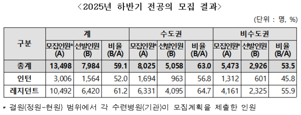 2일 보건복지부와 수련환경평가위원회가 발표한 ‘2025년도 하반기 전공의 모집 결과’에 따르면, 올해 하반기 인턴 및 레지던트 총 7984명(모집인원 1만3498명 대비 59.1%)이 선발됐다.