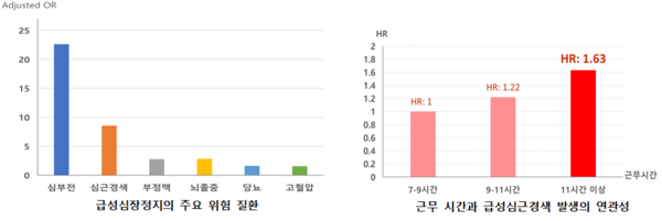 급성심근경색은 급성심장정지의 주요 위험 요인 중 하나로 알려져 있으며, 이와 같은 결과는 장시간 근무가 심장 건강에 부정적인 영향을 미칠 수 있음을 시사한다. 따라서 건강한 근무 환경 조성과 적절한 휴식 확보는 급성심장정지 예방을 위해 필수적이다.