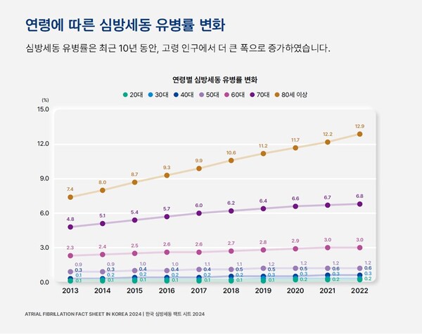 특히 80세 이상 초고령 인구에서의 심방세동 유병률은 12.9%로, 7.4%였던 10년 전에 비해 가장 큰 증가폭을 보였다.