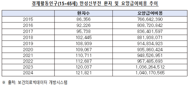 또한 같은 기간 요양급여비용은 7666억 원에서 1조 401억원으로 35.7% 증가한 것으로 나타났는데, 이는 만성콩팥병이 고령층 중심의 질환에서 벗어나 사회·경제의 핵심축인 생산가능 인구층으로 빠르게 확산되고 있음을 보여준다.