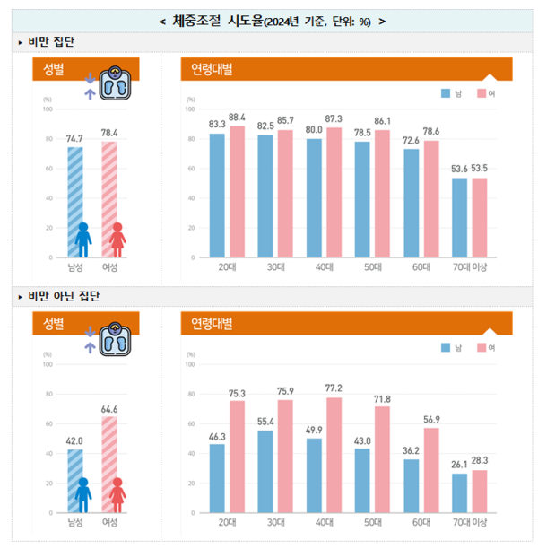 비만이 아닌 사람들은 남성 42.0%, 여성 64.6%로 비만이 아닌 집단에서도 체중조절 시도율이 높게 나타났으며, 특히 여성이 남성보다 약 1.5배 높게 나타났다. 두 집단 모두 고령층으로 갈수록 체중조절 시도율이 낮아지는 경향이 있었다.