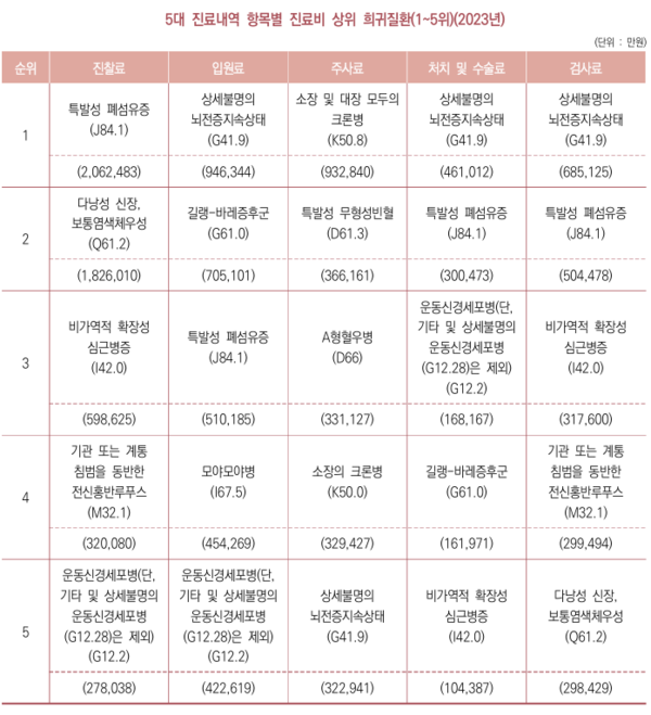 입원료의 경우 △상세 불명의 뇌전증지속상태(94억6344만원) △갈랭-바레증후군(70억5101만원) △특발성 폐섬유증(51억185만원) △모야모야병(45억4269만원) △운동신경세포병(42억2619만원)이었으며, 주사료는 △소장 및 대장 모두의 크론병(93억2840만원) △특발성 무형성빈혈(36억6161만원) △A형혈우병(33억1127만원) △소장의 크론병(32억9427만원) △상세불명의 뇌전증지속상태(32억2941만원)이었다.