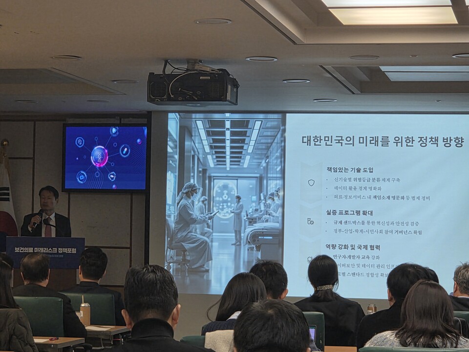 11일 국회의원회관에서 열린 ‘보건의료 미래리스크 정책포럼: 보건의료 피지컬 인공지능의 미래 방향’에서 김강립 전 식품의약품안전처장(현 김·장 법률사무소 고문)은 ‘신기술의 적정한 활용을 위한 리스크 관리 정책 방향’을 주제로 발표하며 “AI, 재생의료, 유전체 기반 정밀의료는 질병의 예측·진단·치료 전 과정을 혁신하고 있다”고 말했다.