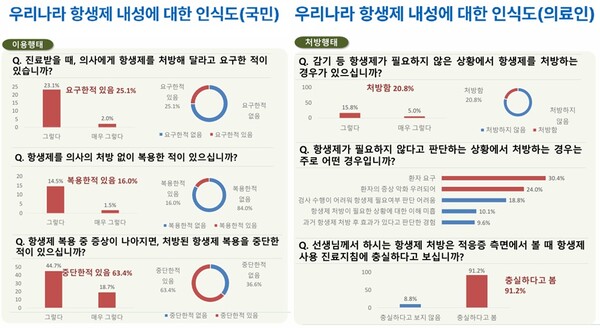 신나리 과장은 “국민은 항생제에 대해 의사에게 처방을 요구하고, 의사 처방 없이 복용하며, 처방받은 항생제 복용 임의 중단 등의 잘못된 행태와 항생제 용도를 잘못 인지하는 비율이 높았다”며 “국민에게 항생제 용도와 적정 사용에 대한 올바른 정보를 지속적으로 제공해야 한다는 점을 시사한다”고 설명했다.