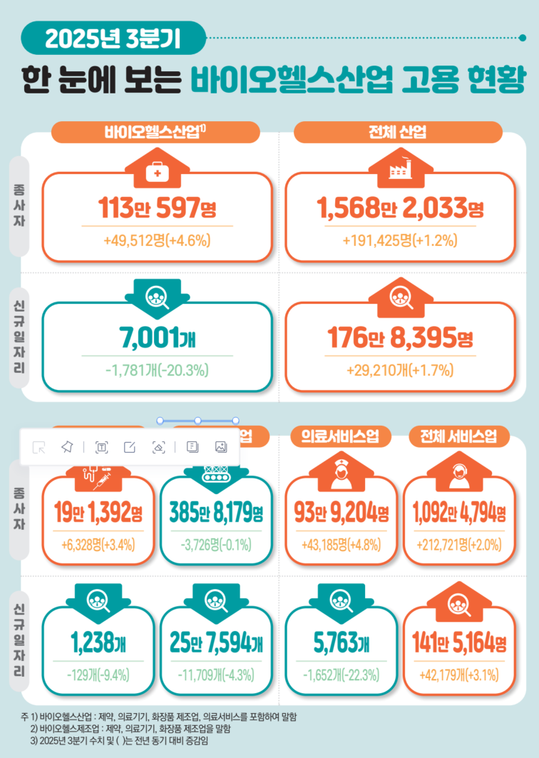 한국보건산업진흥원(원장 차순도)은 29일 발표한 ‘2025년 3/4분기 바이오헬스산업 고용동향’에서 이같이 밝혔다.