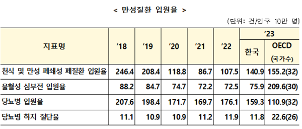 당뇨병 입원율은 인구 10만명당 159건으로 2008년 319건 이후 절반 수준으로 감소했으나, OECD 평균 111건보다 높은 수준이다. 다만 당뇨병 관리의 장기적인 질적 수준을 평가하는 하지 절단율은 인구 10만명당 12건(대절단 3건, 소절단 9건)으로 OECD 평균 23건보다 낮아 예방 관리의 성과는 비교적 긍정적인 것으로 나타났다.