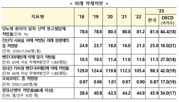 반면, 항생제 처방률은 OECD 2위였으며, 정신보건 영역에서도 평균을 상회하는 것으로 나타났다.